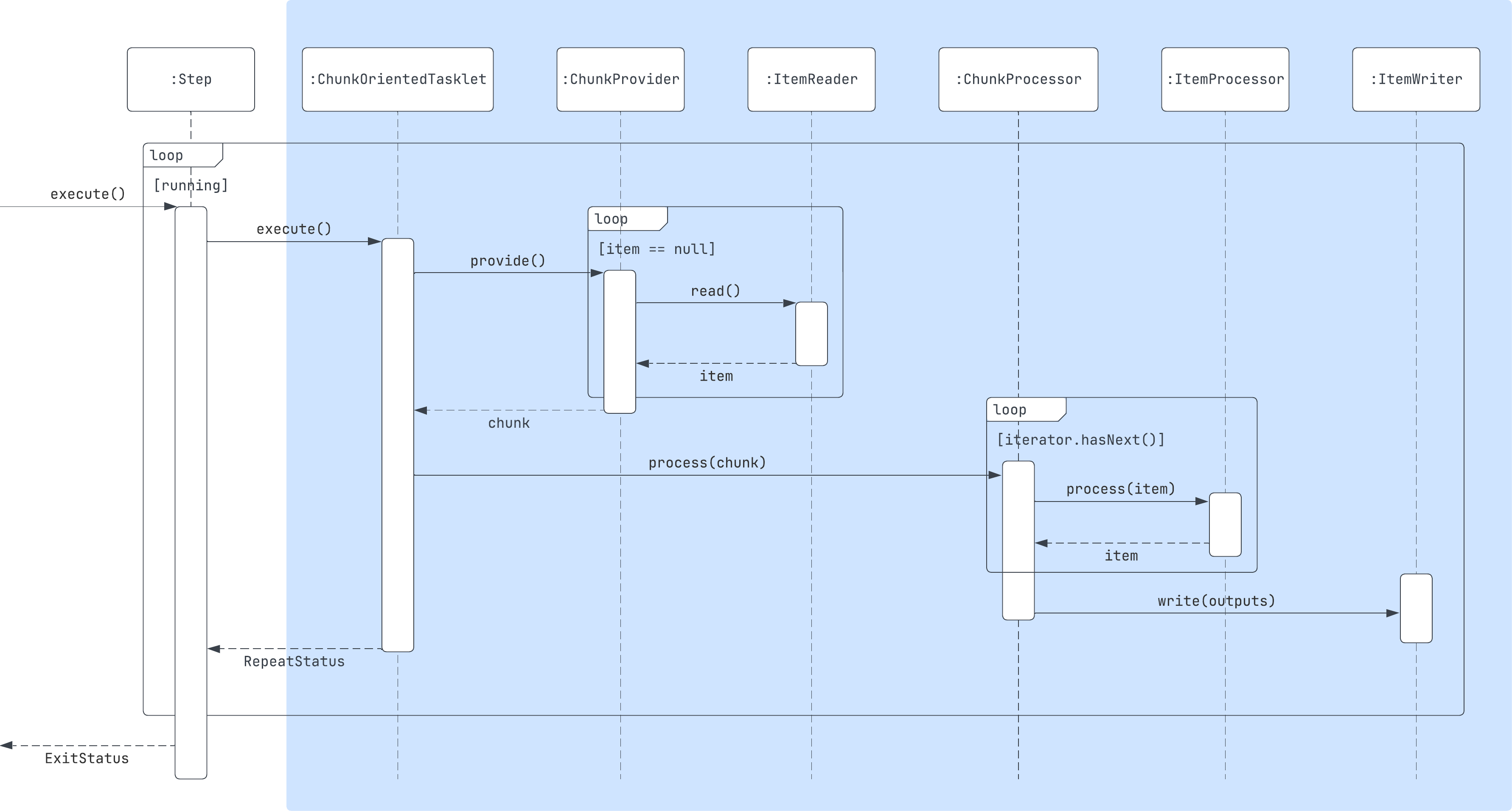 들어가기 전에, 위의 청크 기반 프로세싱의 시퀀스 다이어그램을 한번 더 상기시키고 가면 이해에 도움이 될 것이다. 진행 순서도 핵심이지만, 외부의 루프와 내부의 루프가 있다는 것도 알아두면 좋다.